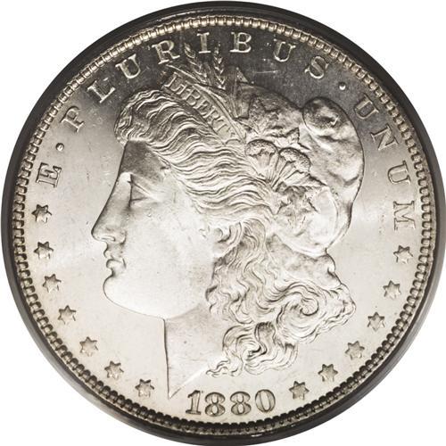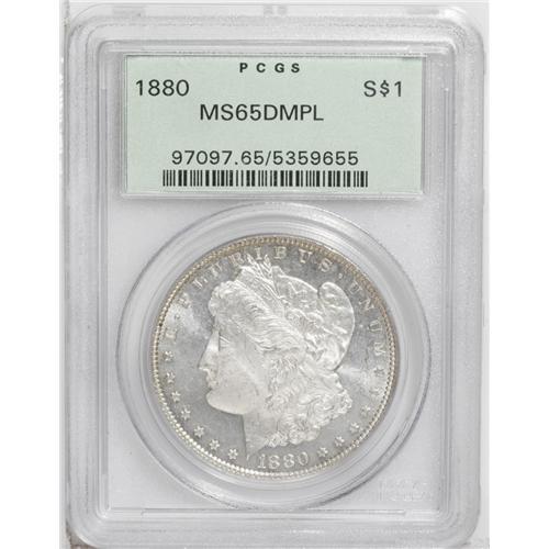 <B>1880<img border='0' src='http://www.heritagecoins.com/images/star.gif' width=10 height=10>$1> MS65 Deep Mirror Prooflike PCGS.</B></I> The vast majority of the remaining coins from the mintage of 12.6 million pieces of the 1880 are baggy MS63-64 and non-prooflike. The situation changes radically when a Prooflike or Deep Mirror Prooflike coin is sought. And very few are known in both Gem condition and with deeply reflective fields. This piece has glassy, mirror-like fields on each side and equally generous mint frost over the devices, the combination producing the desired Deep Mirror Prooflike effect. Exceptionally clean, the surfaces are generally brilliant with just a hint of peripheral color on each side. Population: 27 in 65, 1 finer (8/06).