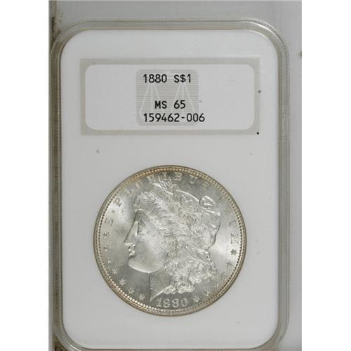 1880 S$1 MS65 NGC. Frosty-white, with the only color a