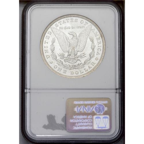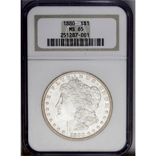 <B>1880<img border='0' src='http://www.heritagecoins.com/images/star.gif' width=10 height=10>$1> MS65 NGC.</B></I> Satiny luster emboldens each side of this sharply impressed Morgan; the hair over Liberty's ear and the breast feathers are strongly defined. The only toning is confined to the rims, which take on a light gold appearance. A small abrasion at the bottom of the eagle's breast likely prevents an even higher grade. Only 31 pieces have been graded higher by NGC (3/06). <BR><BR><B>Important notice:</B> Heritage usually auctions material at the rate of 200-250 lots per hour. On some occasions eBay Live bid software or the Internet may not be able to keep up with the pace of the auction. We recommend placing a realistic absentee bid now as insurance to avoid disappointment. Occasionally the auctioneer may eliminate or reject an eBay Live bid, and the auctioneer may also reopen a lot after the close of the eBay live bidding (usually because we missed an audience bid), and may reject your bid even if it shows you as the winning bidder. By bidding via eBay Live, you agree that Heritage may award the lot to another bidder at its sole discretion under the circumstances described above or any other reasonable circumstances. Since eBay bids are not shown to us until we open the lot on the floor, we treat those bids just like floor bids. In most cases the floor responds before the eBay bid is presented to us, due to Internet lag time, so for consistency we have made it a policy that floor bids are always considered first over tie eBay live bids. Also please note that all Heritage lots purchased through eBay Live carry a 20% Buyer's Premium. Please make sure you read the Terms and Conditions before you bid. This lot is being auctioned in conjunction with a live floor auction by Heritage Galleries & Auctioneers. All final auction and invoice information will be supplied by Heritage Galleries & Auctioneers, and all other information should be considered preliminary. Lot:3255 <BR><BR><B>Winning Notification and Billing:</B> After the FINAL session in this auction is complete, Heritage will send e-mail and snail mail invoices. This process normally takes several days. All final auction and invoice information will be supplied by Heritage Galleries & Auctioneers, and all other information should be considered preliminary. <BR><BR>This auction will be conducted on a live auction floor and over the Internet through eBay Live. If you choose to place an absentee bid, please take a moment to <font color='#0000ff'><u><a href='http://pages.ebay.com/liveauctions/help/before/laabsentee.html'>learn how eBay Live absentee bidding works</a></u></font><font color='#000000'>