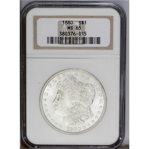 <B>1880<img border='0' src='http://www.heritagecoins.com/images/star.gif' width=10 height=10>$1> MS65 NGC.</B></I> Shimmering cartwheel luster dominates the brilliant, snow-white surfaces. Well struck throughout and often scarce as a Gem. <BR><BR><B>Important notice:</B> Heritage usually auctions material at the rate of 200-250 lots per hour. On some occasions eBay Live bid software or the Internet may not be able to keep up with the pace of the auction. We recommend placing a realistic absentee bid now as insurance to avoid disappointment. Occasionally the auctioneer may eliminate or reject an eBay Live bid, and the auctioneer may also reopen a lot after the close of the eBay live bidding (usually because we missed an audience bid), and may reject your bid even if it shows you as the winning bidder. By bidding via eBay Live, you agree that Heritage may award the lot to another bidder at its sole discretion under the circumstances described above or any other reasonable circumstances. Since eBay bids are not shown to us until we open the lot on the floor, we treat those bids just like floor bids. In most cases the floor responds before the eBay bid is presented to us, due to Internet lag time, so for consistency we have made it a policy that floor bids are always considered first over tie eBay live bids. Also please note that all Heritage lots purchased through eBay Live carry a 20% Buyer's Premium. Please make sure you read the Terms and Conditions before you bid. This lot is being auctioned in conjunction with a live floor auction by Heritage Galleries & Auctioneers. All final auction and invoice information will be supplied by Heritage Galleries & Auctioneers, and all other information should be considered preliminary. Lot:3256 <BR><BR><B>Winning Notification and Billing:</B> After the FINAL session in this auction is complete, Heritage will send e-mail and snail mail invoices. This process normally takes several days. All final auction and invoice information will be supplied by Heritage Galleries & Auctioneers, and all other information should be considered preliminary. <BR><BR>This auction will be conducted on a live auction floor and over the Internet through eBay Live. If you choose to place an absentee bid, please take a moment to <font color='#0000ff'><u><a href='http://pages.ebay.com/liveauctions/help/before/laabsentee.html'>learn how eBay Live absentee bidding works</a></u></font><font color='#000000'>