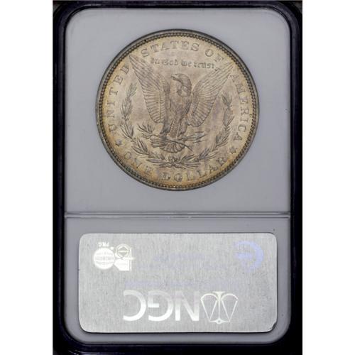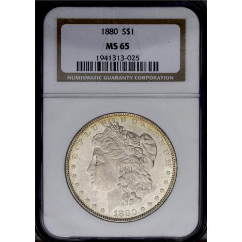 <B>1880<img border='0' src='http://www.heritagecoins.com/images/star.gif' width=10 height=10>$1> MS65 NGC.</B></I> The obverse side of this respectable Gem is covered by rich pastel-golden patina, which is variable between dove-gray and rose. The reverse is clearly defined and well preserved, displaying variegated sunset-golden color. <BR><BR><B>Important notice:</B> Heritage usually auctions material at the rate of 200-250 lots per hour. On some occasions eBay Live bid software or the Internet may not be able to keep up with the pace of the auction. We recommend placing a realistic absentee bid now as insurance to avoid disappointment. Occasionally the auctioneer may eliminate or reject an eBay Live bid, and the auctioneer may also reopen a lot after the close of the eBay live bidding (usually because we missed an audience bid), and may reject your bid even if it shows you as the winning bidder. By bidding via eBay Live, you agree that Heritage may award the lot to another bidder at its sole discretion under the circumstances described above or any other reasonable circumstances. Since eBay bids are not shown to us until we open the lot on the floor, we treat those bids just like floor bids. In most cases the floor responds before the eBay bid is presented to us, due to Internet lag time, so for consistency we have made it a policy that floor bids are always considered first over tie eBay live bids. Also please note that all Heritage lots purchased through eBay Live carry a 20% Buyer's Premium. Please make sure you read the Terms and Conditions before you bid. This lot is being auctioned in conjunction with a live floor auction by Heritage Galleries & Auctioneers. All final auction and invoice information will be supplied by Heritage Galleries & Auctioneers, and all other information should be considered preliminary. Lot:3254 <BR><BR><B>Winning Notification and Billing:</B> After the FINAL session in this auction is complete, Heritage will send e-mail and snail mail invoices. This process normally takes several days. All final auction and invoice information will be supplied by Heritage Galleries & Auctioneers, and all other information should be considered preliminary. <BR><BR>This auction will be conducted on a live auction floor and over the Internet through eBay Live. If you choose to place an absentee bid, please take a moment to <font color='#0000ff'><u><a href='http://pages.ebay.com/liveauctions/help/before/laabsentee.html'>learn how eBay Live absentee bidding works</a></u></font><font color='#000000'>