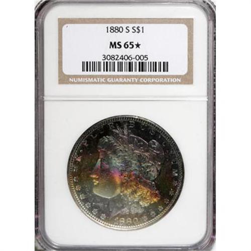 <B>1880-S $1 MS65 S" NGC.</B></I> NGC Census: (25679/11712). PCGS Population (27743/9634). Mintage: 8,900,000. Numismedia Wsl. Price for NGC/PCGS coin in MS65: $118. (#7118)<BR><BR><B>Coin Engraver:</B> George T. Morgan<BR><BR><b>Shipping:</b> Coins & Currency (<a target="_blank" href="http://www.heritageauctions.com/common/shipping.php">view shipping information</a>)