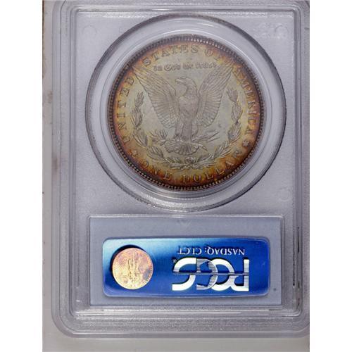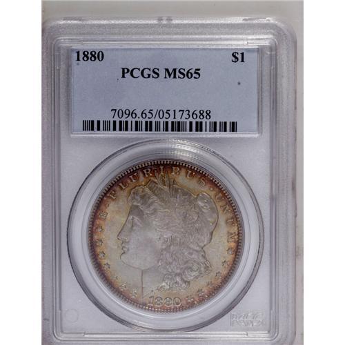 <B>1880<img border='0' src='http://www.heritagecoins.com/images/star.gif' width=10 height=10>$1> MS65 PCGS.</B></I> An attractively toned Gem with concentric red and yellow-orange around a lavender-plum center on the obverse and pale emerald on the reverse. Typically struck for this issue with strong luster.