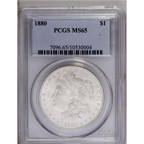 <B>1880<img border='0' src='http://www.heritagecoins.com/images/star.gif' width=10 height=10>$1> MS65 PCGS.</B></I> Lustrous beneath hazy pearl-gray patina. This sharply struck Gem has only a few minor marks, including a couple on Liberty's cheek, near the hair.