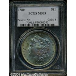 <B>1880<S$1> MS65 PCGS.</B></I> Azure-blue and lemon-golden colors intermingle over the obverse, the reverse is bright, frosty, and untoned. A well defined Gem example of this collectible date that is enhanced by the pretty color.<BR><I>From the JFS Collection.</B></I> <BR><BR><B>Important notice:</B> Heritage usually auctions material at the rate of 200-250 lots per hour. On some occasions eBay Live bid software or the Internet may not be able to keep up with the pace of the auction. We recommend placing a realistic absentee bid now as insurance to avoid disappointment. Occasionally the auctioneer may eliminate or reject an eBay Live bid, and the auctioneer may also reopen a lot after the close of the eBay live bidding (usually because we missed an audience bid), and may reject your bid even if it shows you as the winning bidder. By bidding via eBay Live, you agree that Heritage may award the lot to another bidder at its sole discretion under the circumstances described above or any other reasonable circumstances. Since eBay bids are not shown to us until we open the lot on the floor, we treat those bids just like floor bids. In most cases the floor responds before the eBay bid is presented to us, due to Internet lag time, so for consistency we have made it a policy that floor bids are always considered first over tie eBay live bids. Also please note that all Heritage lots purchased through eBay Live carry a 20% Buyer's Premium. Please make sure you read the Terms and Conditions before you bid. </span></font></tr></table></td></tr></table>