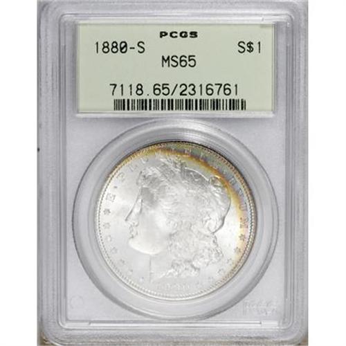 <B>1880-S $1 MS65 PCGS.</B></I> PCGS Population (27918/9767). NGC Census: (26094/11904). Mintage: 8,900,000. Numismedia Wsl. Price for NGC/PCGS coin in MS65: $117. (#7118)<BR><BR><B>Coin Engraver:</B> George T. Morgan<BR><BR><b>Shipping:</b> Coins & Currency (<a target="_blank" href="http://www.heritageauctions.com/common/shipping.php">view shipping information</a>)