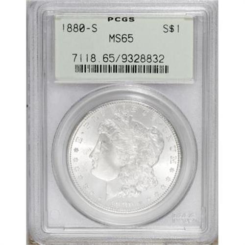 <B>1880-S $1 MS65 PCGS.</B></I> PCGS Population (27935/9776). NGC Census: (26094/11904). Mintage: 8,900,000. Numismedia Wsl. Price for NGC/PCGS coin in MS65: $118. (#7118)<BR><BR><B>Coin Engraver:</B> George T. Morgan<BR><BR><b>Shipping:</b> Coins & Currency (<a target="_blank" href="http://www.heritageauctions.com/common/shipping.php">view shipping information</a>)