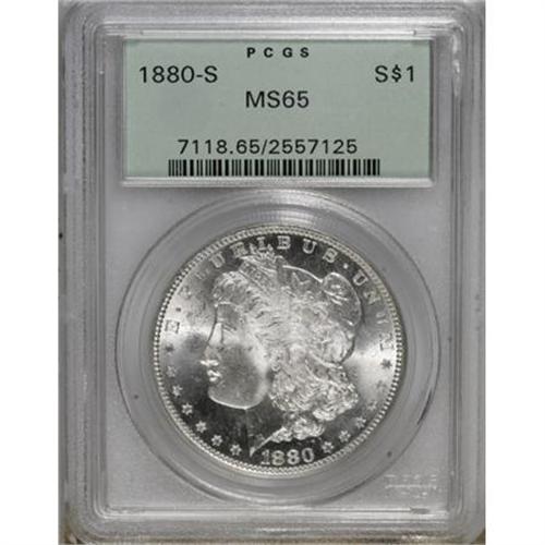 <B>1880-S $1 MS65 PCGS.</B></I> PCGS Population (28058/9872). NGC Census: (26263/12041). Mintage: 8,900,000. Numismedia Wsl. Price for NGC/PCGS coin in MS65: $125. (#7118)<BR><BR><B>Coin Engraver:</B> George T. Morgan<BR><BR><b>Shipping:</b> Coins & Currency (<a target="_blank" href="http://www.heritageauctions.com/common/shipping.php">view shipping information</a>)