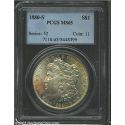 <TR><TD width="100%"><TABLE cellSpacing=1 cellPadding=3 width="100%" border=0><TBODY><TR><TD width="100%" bgColor=#79735c><FONT face=arial color=#ffffff size=3><B>Description</B> </FONT></TD></TR><TR><TD width="100%" bgColor=#ffffff><FONT face=arial size=2><B>1880-S $1 MS65 PCGS.</B></I> Medium S mintmark. While the reverse is fully brilliant, the obverse has magnificent gold, powder-blue, and violet colors. Lustrous and sharply struck with an immaculate reverse. </FONT></TD></TR></TBODY></TABLE></TD></TR></TBODY></TABLE><BR><A name=PricesRealized></A><TABLE cellSpacing=0 cellPadding=0 width="100%" bgColor=#000000 border=0><TBODY><TR><TD width="100%"><TABLE cellSpacing=1 cellPadding=3 width="100%" border=0><TBODY><TR><TD width="100%" bgColor=#79735c><A name=PR><FONT face=arial color=#ffffff size=3><B>Previous Prices from Heritage Auctions</B> </FONT></A></TD></TR><TR><TD bgColor=#f6f6ed><TABLE cellSpacing=0 cellPadding=0 width="100%" border=1><TBODY><TR><TD align=middle width="33%"><B>Date</B></TD><TD align=middle width="33%"><B>Service</B></TD><TD align=middle width="33%"><B>Price</B></TD></TR><TR bgColor=whitesmoke><TD width="33%"><B>03/03/2003</B></TD><TD width="33%">PCGS</TD><TD width="33%">$81.65</TD></TR><TR bgColor=whitesmoke><TD width="33%"><B>01/13/2003</B></TD><TD width="33%">PCGS</TD><TD width="33%">$71.30</TD></TR><TR bgColor=whitesmoke><TD width="33%"><B>11/26/2002</B></TD><TD width="33%">PCGS</TD><TD width="33%">$70.15</TD></TR><TR bgColor=whitesmoke><TD width="33%"><B>10/22/2002</B></TD><TD width="33%">PCGS</TD><TD width="33%">$81.65</TD></TR><TR bgColor=whitesmoke><TD width="33%"><B>10/08/2002</B></TD><TD width="33%">PCGS</TD><TD width="33%">$69.00</TD></TR><TR bgColor=whitesmoke><TD width="33%"><B>09/30/2002</B></TD><TD width="33%">PCGS</TD><TD width="33%">$77.05</TD></TR><TR bgColor=whitesmoke><TD width="33%"><B>09/10/2002</B></TD><TD width="33%">PCGS</TD><TD width="33%">$87.40</TD></TR><TR bgColor=whitesmoke><TD width="33%"><B>07/29/2002</B></TD><TD width="33%">PCGS</TD><TD width="33%">$89.70</TD></TR><TR bgColor=whitesmoke><TD width="33%"><B>07/16/2002</B></TD><TD width="33%">PCGS</TD><TD width="33%">$75.90</TD></TR><TR bgColor=whitesmoke><TD width="33%"><B>07/02/2002</B></TD><TD width="33%">PCGS</TD><TD width="33%">$75.90</TD></TR><TR bgColor=whitesmoke><TD width="33%"><B>03/27/2001</B></TD><TD width="33%">PCGS</TD><TD width="33%">$76.00</TD></TR><TR bgColor=whitesmoke><TD width="33%"><B>04/18/2000</B></TD><TD width="33%">PCGS</TD><TD width="33%">$70.00</TD></TR><TR bgColor=whitesmoke><TD width="33%"><B>03/04/1994</B></TD><TD width="33%">PCGS</TD><TD width="33%">$99.00</TD></TR><TR bgColor=whitesmoke><TD width="33%"><B>12/19/2000</B></TD><TD width="33%">PCGS</TD><TD width="33%">$71.00</TD></TR><TR bgColor=whitesmoke><TD width="33%"><B>08/14/1995</B></TD><TD width="33%">PCGS</TD><TD width="33%">$121.00</TD></TR><TR bgColor=whitesmoke><TD width="33%"><B>05/28/2002</B></TD><TD width="33%">PCGS</TD><TD width="33%">$71.30</TD></TR><TR bgColor=whitesmoke><TD width="33%"><B>05/14/2002</B></TD><TD width="33%">PCGS</TD><TD width="33%">$98.90</TD></TR><TR bgColor=whitesmoke><TD width="33%"><B>04/23/2002</B></TD><TD width="33%">PCGS</TD><TD width="33%">$81.65</TD></TR><TR bgColor=whitesmoke><TD width="33%"><B>04/23/2002</B></TD><TD width="33%">PCGS</TD><TD width="33%">$87.40</TD></TR><TR bgColor=whitesmoke><TD width="33%"><B>04/16/2002</B></TD><TD width="33%">PCGS</TD><TD width="33%">$70.15</TD></TR><TR bgColor=whitesmoke><TD width="33%"><B>09/04/2001</B></TD><TD width="33%">PCGS</TD><TD width="33%">$76.00</TD></TR><TR bgColor=whitesmoke><TD width="33%"><B>08/07/2001</B></TD><TD width="33%">PCGS</TD><TD width="33%">$70.00</TD></TR><TR bgColor=whitesmoke><TD width="33%"><B>07/24/2001</B></TD><TD width="33%">PCGS</TD><TD width="33%">$66.00</TD></TR><TR bgColor=whitesmoke><TD width="33%"><B>03/04/1994</B></TD><TD width="33%">PCGS</TD><TD width="33%">$55.00</TD></TR><TR bgColor=whitesmoke><TD width="33%"><B>04/08/1994</B></TD><TD width="33%">PCGS</TD><TD width="33%">$143.00</TD></TR><TR bgColor=whitesmoke><TD width="33%"><B>06/03/1998</B></TD><TD width="33%">PCGS</TD><TD width="33%">$88.00</TD></TR><TR bgColor=whitesmoke><TD width="33%"><B>05/30/2000</B></TD><TD width="33%">PCGS</TD><TD width="33%">$60.00</TD></TR><TR bgColor=whitesmoke><TD width="33%"><B>03/14/1996</B></TD><TD width="33%">PCGS</TD><TD width="33%">$121.00</TD></TR><TR bgColor=whitesmoke><TD width="33%"><B>10/05/1994</B></TD><TD width="33%">PCGS</TD><TD width="33%">$99.00</TD></TR><TR bgColor=whitesmoke><TD width="33%"><B>10/08/1994</B></TD><TD width="33%">PCGS</TD><TD width="33%">$99.00</TD></TR><TR bgColor=whitesmoke><TD width="33%"><B>05/30/2000</B></TD><TD width="33%">PCGS</TD><TD width="33%">$70.00</TD></TR><TR bgColor=whitesmoke><TD width="33%"><B>03/19/1997</B></TD><TD width="33%">PCGS</TD><TD width="33%">$88.00</TD></TR><TR bgColor=whitesmoke><TD width="33%"><B>04/25/2000</B></TD><TD width="33%">PCGS</TD><TD width="33%">$70.00</TD></TR><TR bgColor=whitesmoke><TD width="33%"><B>07/10/2001</B></TD><TD width="33%">PCGS</TD><TD width="33%">$69.00</TD></TR><TR bgColor=whitesmoke><TD width="33%"><B>06/19/2001</B></TD><TD width="33%">PCGS</TD><TD width="33%">$70.00</TD></TR><TR bgColor=whitesmoke><TD width="33%"><B>04/26/1996</B></TD><TD width="33%">PCGS</TD><TD width="33%">$110.00</TD></TR><TR bgColor=whitesmoke><TD width="33%"><B>05/05/2000</B></TD><TD width="33%">PCGS</TD><TD width="33%">$373.75</TD></TR><TR bgColor=whitesmoke><TD width="33%"><B>04/11/1997</B></TD><TD width="33%">PCGS</TD><TD width="33%">$82.50</TD></TR><TR bgColor=whitesmoke><TD width="33%"><B>02/24/2002</B></TD><TD width="33%">PCGS</TD><TD width="33%">$74.75</TD></TR><TR bgColor=whitesmoke><TD width="33%"><B>02/23/2002</B></TD><TD width="33%">PCGS</TD><TD width="33%">$172.50</TD></TR><TR bgColor=whitesmoke><TD width="33%"><B>11/27/2001</B></TD><TD width="33%">PCGS</TD><TD width="33%">$74.00</TD></TR><TR bgColor=whitesmoke><TD width="33%"><B>06
