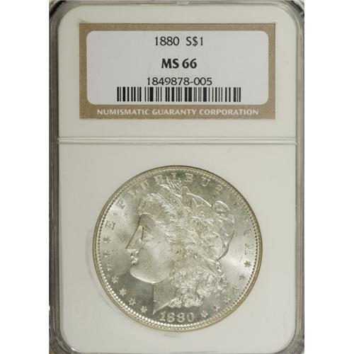 <B>1880 S$1 MS66 NGC.</B></I> A high-grade pearl-gray representative of this conditionally rare Philadelphia issue. The strand of hair over Liberty's ear shows slight blending, but the strike is otherwise precise, and both sides are beautifully smooth. Census: 34 in 66, 0 finer (2/07).<BR><BR><b>Shipping:</b> Coins & Currency (<a target="_blank" href="http://www.heritageauctions.com/common/shipping.php">view shipping information</a>)