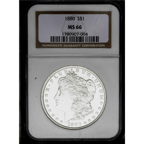<B>1880<img border='0' src='http://www.heritagecoins.com/images/star.gif' width=10 height=10>$1> MS66 NGC.</B></I> Blazing white throughout with ample frost on the devices and strong eye appeal. The surfaces are excellent for the grade, with a few trivial ticks from handling, but far and away fewer than usually encountered on this date. Years of searching for Gem examples has yielded few that qualify by the exacting standards of today, as most fall well short of the quality offered here. An important coin for the specialist. Census: 30 in 66, 1 finer (3/06). <BR><BR><B>Important notice:</B> Heritage usually auctions material at the rate of 200-250 lots per hour. On some occasions eBay Live bid software or the Internet may not be able to keep up with the pace of the auction. We recommend placing a realistic absentee bid now as insurance to avoid disappointment. Occasionally the auctioneer may eliminate or reject an eBay Live bid, and the auctioneer may also reopen a lot after the close of the eBay live bidding (usually because we missed an audience bid), and may reject your bid even if it shows you as the winning bidder. By bidding via eBay Live, you agree that Heritage may award the lot to another bidder at its sole discretion under the circumstances described above or any other reasonable circumstances. Since eBay bids are not shown to us until we open the lot on the floor, we treat those bids just like floor bids. In most cases the floor responds before the eBay bid is presented to us, due to Internet lag time, so for consistency we have made it a policy that floor bids are always considered first over tie eBay live bids. Also please note that all Heritage lots purchased through eBay Live carry a 20% Buyer's Premium. Please make sure you read the Terms and Conditions before you bid. This lot is being auctioned in conjunction with a live floor auction by Heritage Galleries & Auctioneers. All final auction and invoice information will be supplied by Heritage Galleries & Auctioneers, and all other information should be considered preliminary. Lot:3258 <BR><BR><B>Winning Notification and Billing:</B> After the FINAL session in this auction is complete, Heritage will send e-mail and snail mail invoices. This process normally takes several days. All final auction and invoice information will be supplied by Heritage Galleries & Auctioneers, and all other information should be considered preliminary. <BR><BR>This auction will be conducted on a live auction floor and over the Internet through eBay Live. If you choose to place an absentee bid, please take a moment to <font color='#0000ff'><u><a href='http://pages.ebay.com/liveauctions/help/before/laabsentee.html'>learn how eBay Live absentee bidding works</a></u></font><font color='#000000'>