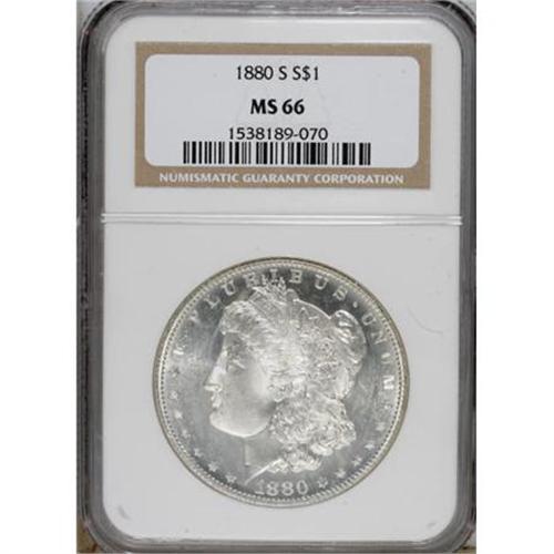 <B>1880-S $1 MS66 NGC.</B></I> NGC Census: (8867/2695). PCGS Population (8007/1560). Mintage: 8,900,000. Numismedia Wsl. Price for NGC/PCGS coin in MS66: $248. (#7118)<BR><BR><b>Shipping:</b> Coins & Currency (<a target="_blank" href="http://www.heritageauctions.com/common/shipping.php">view shipping information</a>)