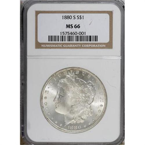 <B>1880-S $1 MS66 NGC.</B></I> NGC Census: (8901/2709). PCGS Population (8007/1560). Mintage: 8,900,000. Numismedia Wsl. Price for NGC/PCGS coin in MS66: $248. (#7118)<BR><BR><B>Coin Engraver:</B> George T. Morgan<BR><BR><b>Shipping:</b> Coins & Currency (<a target="_blank" href="http://www.heritageauctions.com/common/shipping.php">view shipping information</a>\)