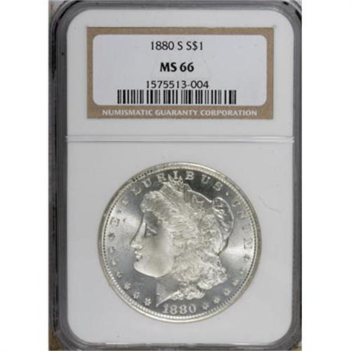<B>1880-S $1 MS66 NGC.</B></I> NGC Census: (8901/2709). PCGS Population (8007/1560). Mintage: 8,900,000. Numismedia Wsl. Price for NGC/PCGS coin in MS66: $248. (#7118)<BR><BR><B>Coin Engraver:</B> George T. Morgan<BR><BR><b>Shipping:</b> Coins & Currency (<a target="_blank" href="http://www.heritageauctions.com/common/shipping.php">view shipping information</a>\)