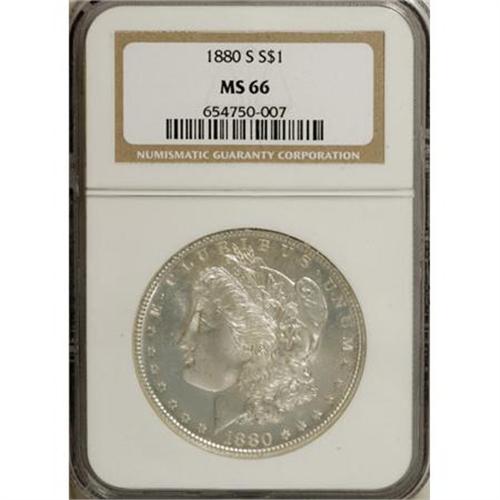<B>1880-S $1 MS66 NGC.</B></I> NGC Census: (8948/2733). PCGS Population (8035/1567). Mintage: 8,900,000. Numismedia Wsl. Price for NGC/PCGS coin in MS66: $248. (#7118)<BR><BR><B>Coin Engraver:</B> George T. Morgan<BR><BR><b>Shipping:</b> Coins & Currency (<a target="_blank" href="http://www.heritageauctions.com/common/shipping.php">view shipping information</a>\)