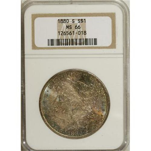 <B>1880-S $1 MS66 NGC.</B></I> NGC Census: (8948/2733). PCGS Population (8035/1567). Mintage: 8,900,000. Numismedia Wsl. Price for NGC/PCGS coin in MS66: $248. (#7118)<BR><BR><B>Coin Engraver:</B> George T. Morgan<BR><BR><b>Shipping:</b> Coins & Currency (<a target="_blank" href="http://www.heritageauctions.com/common/shipping.php">view shipping information</a>\)