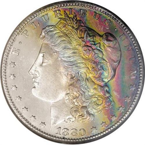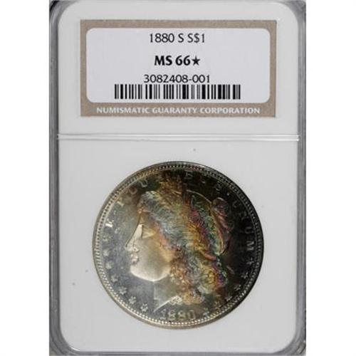 <B>1880-S $1 MS66 <img border='0' src='http://www.heritagecoins.com/images/star.gif' width=10 height=10> NGC.</B></I> Medium S. Gorgeous bands of cherry-red, apple-green, gold, and sky-blue alternate across this crisply struck Morgan dollar. The reverse and the portrait are well preserved, and the obverse field has only minor contact. An opportunity for the connoisseur of original toning.<BR><BR><B>Coin Engraver:</B> George T. Morgan<BR><BR><b>Shipping:</b> Coins & Currency (<a target="_blank" href="http://www.heritageauctions.com/common/shipping.php">view shipping information</a>)