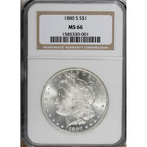 <B>1880-S $1 MS66 NGC.</B></I> NGC Census: (8961/2751). PCGS Population (8049/1577). Mintage: 8,900,000. Numismedia Wsl. Price for NGC/PCGS coin in MS66: $248. (#7118)<BR><BR><B>Coin Engraver:</B> George T. Morgan<BR><BR><b>Shipping:</b> Coins & Currency (<a target="_blank" href="http://www.heritageauctions.com/common/shipping.php">view shipping information</a>)