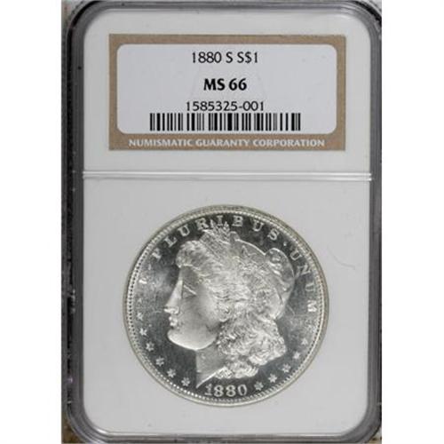 <B>1880-S $1 MS66 NGC.</B></I> NGC Census: (8961/2751). PCGS Population (8049/1577). Mintage: 8,900,000. Numismedia Wsl. Price for NGC/PCGS coin in MS66: $248. (#7118)<BR><BR><B>Coin Engraver:</B> George T. Morgan<BR><BR><b>Shipping:</b> Coins & Currency (<a target="_blank" href="http://www.heritageauctions.com/common/shipping.php">view shipping information</a>)