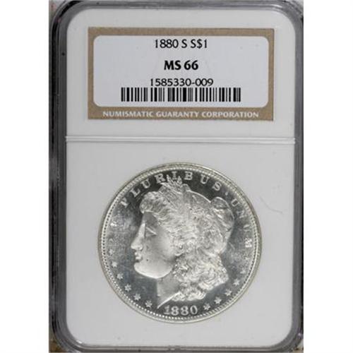 <B>1880-S $1 MS66 NGC.</B></I> NGC Census: (8961/2751). PCGS Population (8049/1577). Mintage: 8,900,000. Numismedia Wsl. Price for NGC/PCGS coin in MS66: $248. (#7118)<BR><BR><B>Coin Engraver:</B> George T. Morgan<BR><BR><b>Shipping:</b> Coins & Currency (<a target="_blank" href="http://www.heritageauctions.com/common/shipping.php">view shipping information</a>)