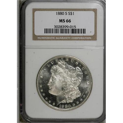 <B>1880-S $1 MS66 NGC.</B></I> NGC Census: (8987/2759). PCGS Population (8090/1604). Mintage: 8,900,000. Numismedia Wsl. Price for NGC/PCGS coin in MS66: $240. (#7118)<BR><BR><B>Coin Engraver:</B> George T. Morgan<BR><BR><b>Shipping:</b> Coins & Currency (<a target="_blank" href="http://www.heritageauctions.com/common/shipping.php">view shipping information</a>)