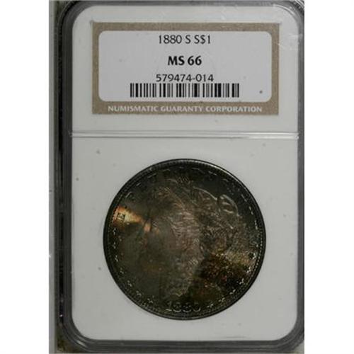 <B>1880-S $1 MS66 NGC.</B></I> NGC Census: (8987/2759). PCGS Population (8090/1604). Mintage: 8,900,000. Numismedia Wsl. Price for NGC/PCGS coin in MS66: $240. (#7118)<BR><BR><B>Coin Engraver:</B> George T. Morgan<BR><BR><b>Shipping:</b> Coins & Currency (<a target="_blank" href="http://www.heritageauctions.com/common/shipping.php">view shipping information</a>)