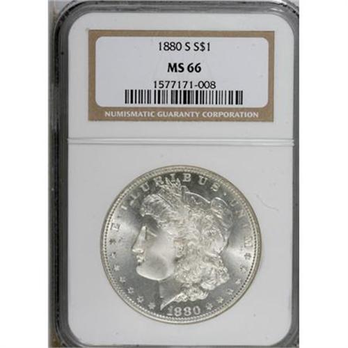 <B>1880-S $1 MS66 NGC.</B></I> NGC Census: (8987/2759). PCGS Population (8097/1601). Mintage: 8,900,000. Numismedia Wsl. Price for NGC/PCGS coin in MS66: $240. (#7118)<BR><BR><B>Coin Engraver:</B> George T. Morgan<BR><BR><b>Shipping:</b> Coins & Currency (<a target="_blank" href="http://www.heritageauctions.com/common/shipping.php">view shipping information</a>)