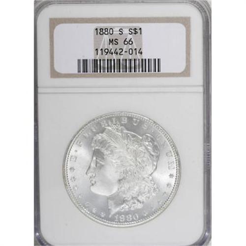 <B>1880-S $1 MS66 NGC.</B></I> NGC Census: (9081/2815). PCGS Population (8131/1636). Mintage: 8,900,000. Numismedia Wsl. Price for NGC/PCGS coin in MS66: $240. (#7118)<BR><BR><B>Coin Engraver:</B> George T. Morgan<BR><BR><b>Shipping:</b> Coins & Currency (<a target="_blank" href="http://www.heritageauctions.com/common/shipping.php">view shipping information</a>)