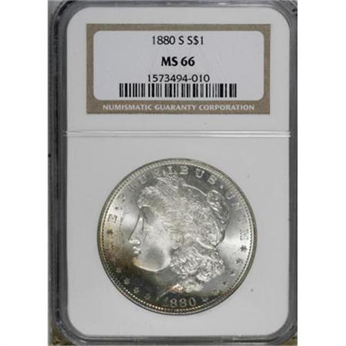 <B>1880-S $1 MS66 NGC.</B></I> . NGC Census: (9162/2872). PCGS Population (8174/1654). Mintage: 8,900,000. Numismedia Wsl. Price for NGC/PCGS coin in MS66: $240. (#7118)<BR><BR><B>Coin Engraver:</B> George T. Morgan<BR><BR><b>Shipping:</b> Coins & Currency (<a target="_blank" href="http://www.heritageauctions.com/common/shipping.php">view shipping information</a>)