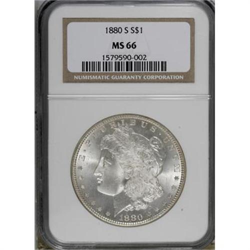<B>1880-S $1 MS66 NGC.</B></I> . NGC Census: (9162/2872). PCGS Population (8174/1654). Mintage: 8,900,000. Numismedia Wsl. Price for NGC/PCGS coin in MS66: $240. (#7118)<BR><BR><B>Coin Engraver:</B> George T. Morgan<BR><BR><b>Shipping:</b> Coins & Currency (<a target="_blank" href="http://www.heritageauctions.com/common/shipping.php">view shipping information</a>)
