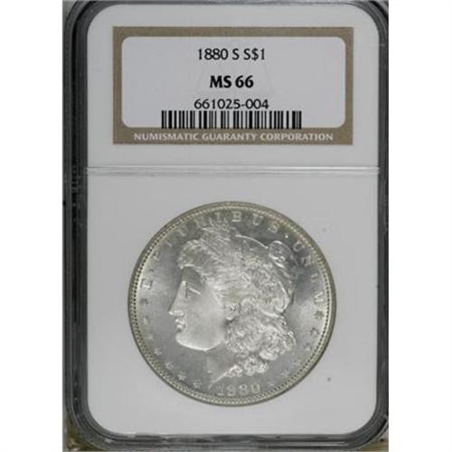 <B>1880-S $1 MS66 NGC.</B></I> . NGC Census: (9162/2872). PCGS Population (8174/1654). Mintage: 8,900,000. Numismedia Wsl. Price for NGC/PCGS coin in MS66: $240. (#7118)<BR><BR><B>Coin Engraver:</B> George T. Morgan<BR><BR><b>Shipping:</b> Coins & Currency (<a target="_blank" href="http://www.heritageauctions.com/common/shipping.php">view shipping information</a>)
