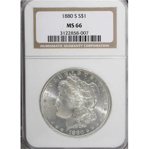 <B>1880-S $1 MS66 NGC.</B></I> NGC Census: (9203/2904). PCGS Population (8228/1675). Mintage: 8,900,000. Numismedia Wsl. Price for NGC/PCGS coin in MS66: $240. (#7118)<BR><BR><B>Coin Engraver:</B> George T. Morgan<BR><BR><b>Shipping:</b> Coins & Currency (<a target="_blank" href="http://www.heritageauctions.com/common/shipping.php">view shipping information</a>)