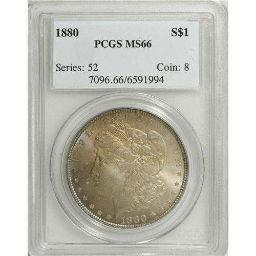 <B>1880 S$1 MS66 PCGS.</B></I> Deep golden-brown, russet, pewter-gray, cobalt-blue, and iridescent violet toning covers the surfaces of this well struck Premium Gem. No distracting abrasions are present, and the luster shines through the dense toning. This lovely Morgan would be right at home in the finest set of silver dollars. Population: 75 in 66, 0 finer (2/07).<BR><BR><b>Shipping:</b> Coins & Currency (<a target="_blank" href="http://www.heritageauctions.com/common/shipping.php">view shipping information</a>)