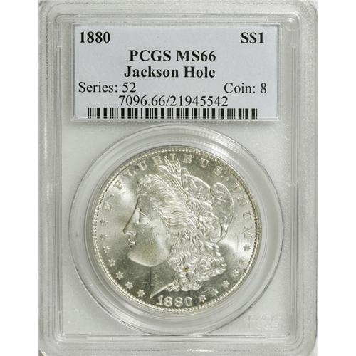 <B>1880 S$1 MS66 PCGS.</B></I> Ex: Jackson Hole. This untoned silver-white example (save for three tiny obverse toning flecks) shows brilliant luster cascading from the surfaces, with a remarkable lack of mentionable abrasions, large or small. A hint of strike weakness shows on the hair over Liberty's ear. Despite the generous mintage exceeding 12 million pieces, Premium Gems are surprisingly elusive, with 75 coins so graded at PCGS. Neither NGC nor PCGS has certified a finer piece (2/07).<BR><I>From The Jackson Hole Collection.</B></I><BR><BR><b>Shipping:</b> Coins & Currency (<a target="_blank" href="http://www.heritageauctions.com/common/shipping.php">view shipping information</a>)