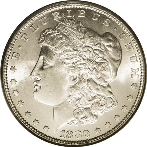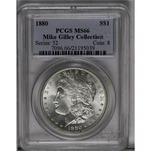 <B>1880<img border='0' src='http://www.heritagecoins.com/images/star.gif' width=10 height=10>$1> MS66 PCGS.</B></I> Ex: Mike Gilley Collection. The 1879 and 1880 dollars are decidedly underrated in Gem and higher grades. While both saw abundant (probably Mint officials of the era thought they were "exorbitant") mintages, they are both decidedly elusive in Gem or better condition. While pieces are available for a price, the numbers are insufficient for the large numbers of Morgan dollar collectors eagerly seeking them out. This specimen offers gorgeous cartwheel luster over untoned surfaces. Population: 66 in 66, 0 finer (6/06).