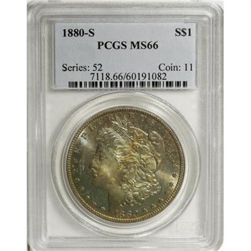 <B>1880-S $1 MS66 PCGS.</B></I> Boldly impressed with vibrant luster, two hallmarks of this popular type issue. The obverse exhibits rich lime-green patina with mint and jade accents, while the reverse is silver-gray.<BR><BR><B>Coin Engraver:</B> George T. Morgan<BR><BR><b>Shipping:</b> Coins & Currency (<a target="_blank" href="http://www.heritageauctions.com/common/shipping.php">view shipping information</a>)
