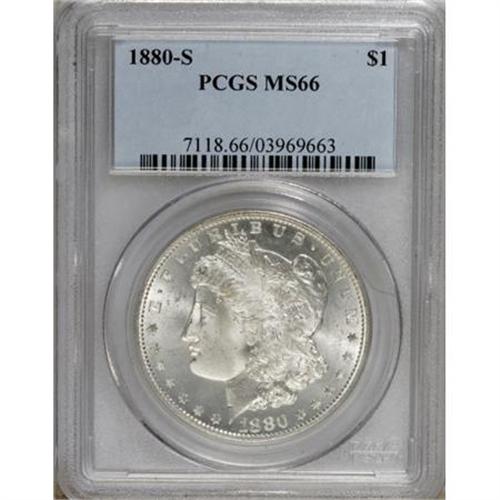 <B>1880-S $1 MS66 PCGS.</B></I> PCGS Population (8049/1577). NGC Census: (8961/2751). Mintage: 8,900,000. Numismedia Wsl. Price for NGC/PCGS coin in MS66: $248. (#7118)<BR><BR><B>Coin Engraver:</B> George T. Morgan<BR><BR><b>Shipping:</b> Coins & Currency (<a target="_blank" href="http://www.heritageauctions.com/common/shipping.php">view shipping information</a>)