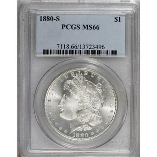 <B>1880-S $1 MS66 PCGS.</B></I> PCGS Population (8093/1600). NGC Census: (8987/2759). Mintage: 8,900,000. Numismedia Wsl. Price for NGC/PCGS coin in MS66: $240. (#7118)<BR><BR><B>Coin Engraver:</B> George T. Morgan<BR><BR><b>Shipping:</b> Coins & Currency (<a target="_blank" href="http://www.heritageauctions.com/common/shipping.php">view shipping information</a>)