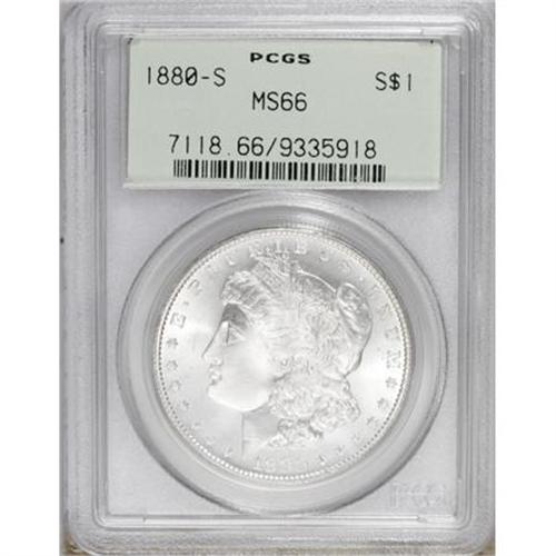 <B>1880-S $1 MS66 PCGS.</B></I> PCGS Population (8139/1637). NGC Census: (9085/2819). Mintage: 8,900,000. Numismedia Wsl. Price for NGC/PCGS coin in MS66: $240. (#7118)<BR><BR><B>Coin Engraver:</B> George T. Morgan<BR><BR><b>Shipping:</b> Coins & Currency (<a target="_blank" href="http://www.heritageauctions.com/common/shipping.php">view shipping information</a>)