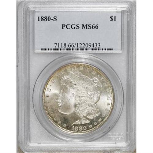 <B>1880-S $1 MS66 PCGS.</B></I> . PCGS Population (8162/1652). NGC Census: (9158/2870). Mintage: 8,900,000. Numismedia Wsl. Price for NGC/PCGS coin in MS66: $240. (#7118)<BR><BR><B>Coin Engraver:</B> George T. Morgan<BR><BR><b>Shipping:</b> Coins & Currency (<a target="_blank" href="http://www.heritageauctions.com/common/shipping.php">view shipping information</a>)