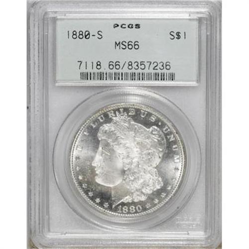 <B>1880-S $1 MS66 PCGS.</B></I> . PCGS Population (8162/1652). NGC Census: (9158/2870). Mintage: 8,900,000. Numismedia Wsl. Price for NGC/PCGS coin in MS66: $240. (#7118)<BR><BR><B>Coin Engraver:</B> George T. Morgan<BR><BR><b>Shipping:</b> Coins & Currency (<a target="_blank" href="http://www.heritageauctions.com/common/shipping.php">view shipping information</a>)