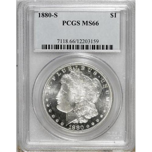<B>1880-S $1 MS66 PCGS.</B></I> . PCGS Population (8162/1652). NGC Census: (9164/2871). Mintage: 8,900,000. Numismedia Wsl. Price for NGC/PCGS coin in MS66: $240. (#7118)<BR><BR><B>Coin Engraver:</B> George T. Morgan<BR><BR><b>Shipping:</b> Coins & Currency (<a target="_blank" href="http://www.heritageauctions.com/common/shipping.php">view shipping information</a>)