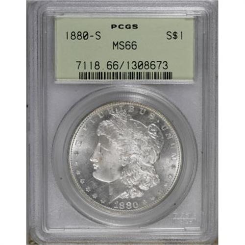 <B>1880-S $1 MS66 PCGS.</B></I> PCGS Population (8185/1663). NGC Census: (9162/2872). Mintage: 8,900,000. Numismedia Wsl. Price for NGC/PCGS coin in MS66: $240. (#7118)<BR><BR><B>Coin Engraver:</B> George T. Morgan<BR><BR><b>Shipping:</b> Coins & Currency (<a target="_blank" href="http://www.heritageauctions.com/common/shipping.php">view shipping information</a>)