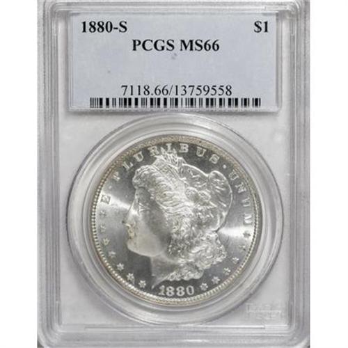 <B>1880-S $1 MS66 PCGS.</B></I> PCGS Population (8203/1669). NGC Census: (9160/2881). Mintage: 8,900,000. Numismedia Wsl. Price for NGC/PCGS coin in MS66: $240. (#7118)<BR><BR><B>Coin Engraver:</B> George T. Morgan<BR><BR><b>Shipping:</b> Coins & Currency (<a target="_blank" href="http://www.heritageauctions.com/common/shipping.php">view shipping information</a>)