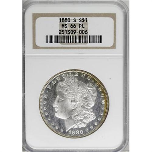 <B>1880-S $1 MS66 Prooflike NGC.</B></I> Large S. This flashy Premium Gem has an essentially pristine reverse, and the obverse is also attractively preserved. Yellow-gold toning visits the borders, but the fields and devices are brilliant.<BR><BR><B>Coin Engraver:</B> George T. Morgan<BR><BR><b>Shipping:</b> Coins & Currency (<a target="_blank" href="http://www.heritageauctions.com/common/shipping.php">view shipping information</a>\)