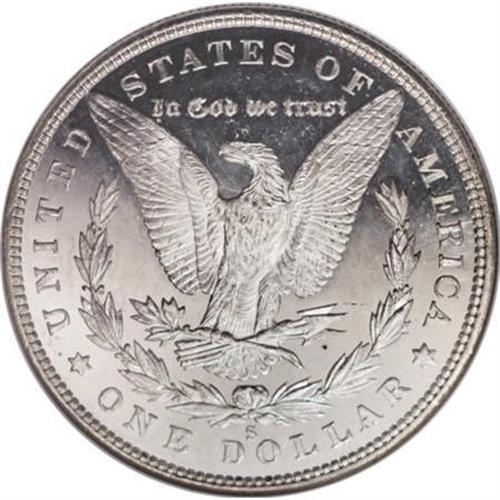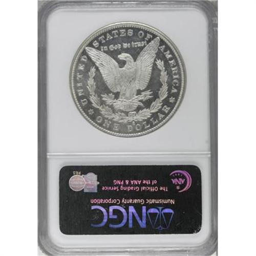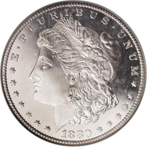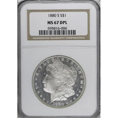 <B>1880-S $1 MS67 Deep Mirror Prooflike NGC.</B></I> The 1880-S dollar, with a mintage of nearly 9 million pieces, is one of the most plentiful of early Morgans. Even Deep Mirror Prooflike specimens through the MS65 level of preservation can be located without too much trouble. Superb Deep Mirror pieces, however, are much more elusive. This essentially untoned MS67 example displays stunning field-motif contrast, and has been well cared for. These attributes are complemented by a powerful strike that emboldens the design elements. Census: 14 in 67 Deep Mirror Prooflike, 3 finer (8/07).<BR><BR><b>Shipping:</b> Coins & Currency (<a target="_blank" href="http://www.heritageauctions.com/common/shipping.php">view shipping information</a>)