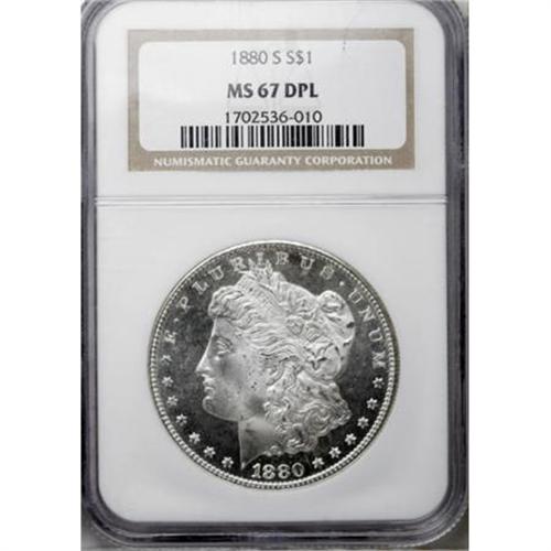 <B>1880-S $1 MS67 Deep Mirror Prooflike NGC.</B></I> This is an exquisite and Superb Gem with amazing aesthetic appeal. The surfaces on each side are absolutely brilliant without any evidence of toning. With deeply mirrored fields and lustrous devices, this lovely dollar has exceptional contrast. This is the Large Mintmark variety with the upper interior space filled. The population at this grade has only increased by a few coins over the past few years. Census: 15 in 67, 3 finer (12/07).<BR><BR><b>Shipping:</b> Coins & Currency (<a target="_blank" href="http://www.heritageauctions.com/common/shipping.php">view shipping information</a>)