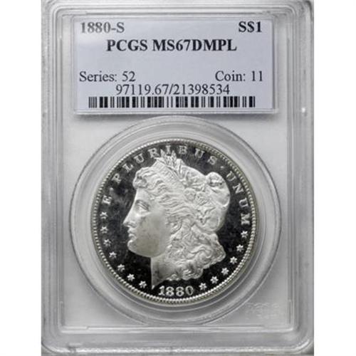 <B>1880-S $1 MS67 Deep Mirror Prooflike PCGS.</B></I> The 1880-S, with a mintage approaching 9 million pieces, is one of the most plentiful of all early Morgan dollars. Even Prooflike coins are common, including Deep Mirrors through MS65. The certified population of Premium Gem Deep Mirrors drops somewhat, and decreases significantly more at the MS67 level. The Superb Gem Deep Mirror Prooflike in this lot displays heavily frosted, boldly struck design elements that stand above the deep mirror fields. Both sides are untoned and impeccably preserved. Population: 26 in 67 Deep Mirror Prooflike, 2 finer (11/07).<BR><I>From The New York Eye Appeal Collection, Part Three.</B></I><BR><BR><b>Shipping:</b> Coins & Currency (<a target="_blank" href="http://www.heritageauctions.com/common/shipping.php">view shipping information</a>)
