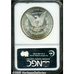<B>1880-S<img border='0' src='http://www.heritagecoins.com/images/star.gif' width=10 height=10>$1 MS67 <img border='0' src='http://www.heritagecoins.com/images/star.gif' width=10 height=10> NGC.</B></I> A crescent of multicolored toning visits the left obverse border, and a touch of gold-brown is noted on the lower reverse. The design elements are sharply struck up. This appealing S-mint is very deserving of the star designation.