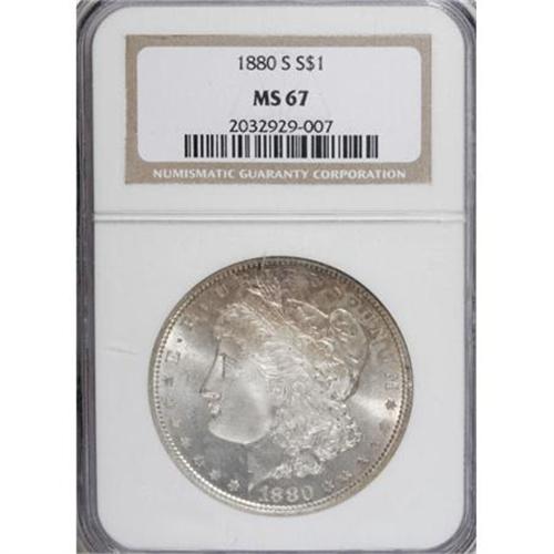 <B>1880-S $1 MS67 NGC.</B></I> Large S. A clean-cheeked Superb Gem with dazzling cartwheel effect in the fields aided by peripheral splashes of orange and rose-red toning.<BR><BR><b>Shipping:</b> Coins & Currency (<a target="_blank" href="http://www.heritageauctions.com/common/shipping.php">view shipping information</a>)